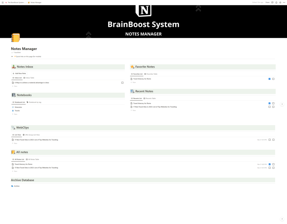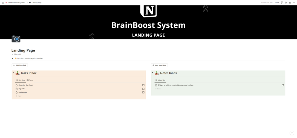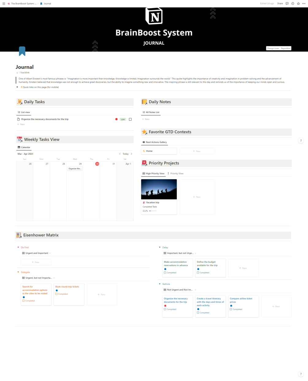 The BrainBoost System: Your Productivity & Creativity Solution is a personal organization system that can help improve the user's productivity and organization in their daily tasks. With an innovative approach that combines the GTD method and the Build a Second Brain, this system offers a complete set of pages that work together to provide an overview of all available functionalities.